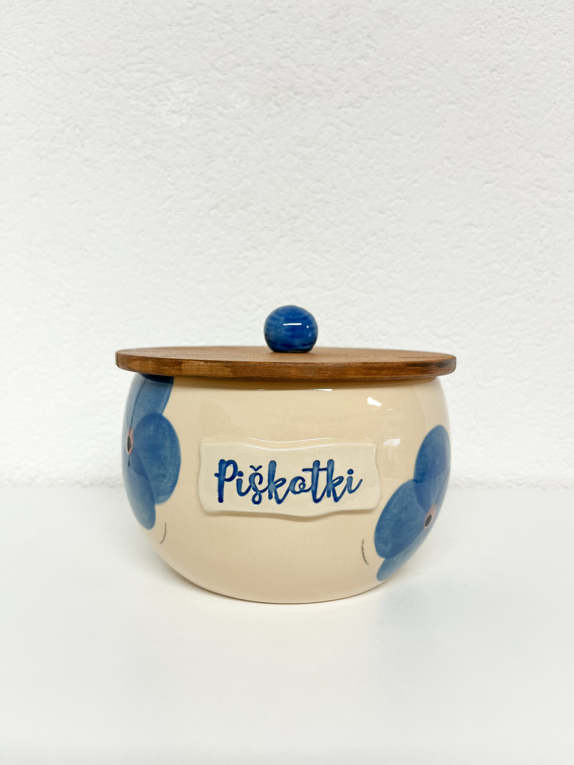 Keramična posoda z lesenim pokrovom, keramičnim ročkom in napisom piškoti je lahko prikupno darilo za vaše najbližje kot tudi za vas same.